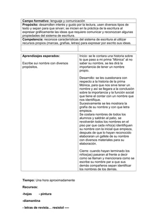 Este documento describe un plan de lección para desarrollar en los estudiantes el interés y gusto por la lectura y escritura. El objetivo es que los estudiantes se inicien en la práctica de la escritura para expresar sus ideas y reconozcan características básicas del sistema de escritura como letras y grafías. La lección incluye contar una historia, cuestionar a los estudiantes sobre la importancia de los nombres, mostrar la grafía de sus nombres y tenerlos escriban y elaboren gafetes con sus nombres.