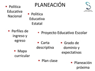 Este documento presenta los pasos para realizar una planeación didáctica efectiva. Describe 10 pasos que incluyen identificar datos de la materia, objetivos generales y específicos, distribución de temas, estrategias de enseñanza, actividades de aprendizaje independiente y con docente, evaluación, materiales, y referencias bibliográficas. Además, ofrece información sobre cómo diseñar objetivos de aprendizaje claros y alcanzables.