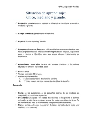 Forma, espacio ymedida Situación de aprendizaje: Chicó, medianó y grande.  Propósito: que el educando observe la diferencia e identifique entre chico, mediano y grande.  Campo formativo: pensamiento matemático  Aspecto: forma espacio y medida  Competencia que se favorece: utiliza unidades no convencionales para resolver problemas que implican medir magnitudes de longitud, capacidad, peso y tiempo e identifica para que sirven algunos instrumentos de evaluación.  Aprendizajes esperados: ordena de manera creciente y decreciente objetos por tamaño, capacidad, peso.  Edad: 5 años.  Tiempo estimado: 30minutos.  Recursos y/o materiales: 1. 3 vasos desechables de diferente tamaño 2. 17 hojas con un ejercicio con caritas de diferente tamaño. Secuencia:  Inicio: se les cuestionará a los pequeños acerca de las medidas de magnitud (chico mediano y grande).  Desarrollo: Enseguida con vasos desechables se les pondrá el ejemplo sobre ello, y ellos darán opciones acerca del orden que deben de llevar. Se les repartirá una hoja la cual contiene un ejercicio acerca del tema.  Cierre: se les pedirá que mencionen 3 objetos del salón (uno chico, uno mediano y uno grande).
