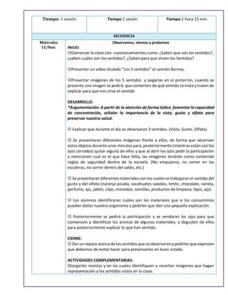 Este documento presenta un plan de lecciones sobre los cinco sentidos para un grupo de 3er grado en la escuela primaria Gabriel García Márquez. El plan incluye tres sesiones para explorar los sentidos de la vista, el olfato y el gusto, la audición y el tacto a través de actividades como observar imágenes, identificar olores y sabores, y reconocer sonidos y texturas. El objetivo es que los estudiantes reconozcan la importancia de cuidar sus sentidos y aplicar medidas de higiene para mantener una buena sal