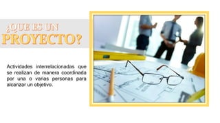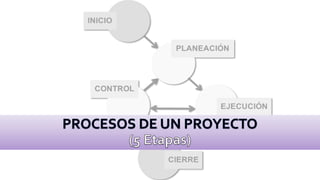 El documento describe las diferentes etapas de un proyecto, incluyendo inicio, planeación, ejecución, control y cierre. Explica las actividades clave en cada etapa como elaborar un plan de proyecto, gestionar recursos, monitorear el progreso, y realizar una evaluación final. También cubre herramientas como el diagrama de Gantt y la ruta crítica para ayudar a planificar y administrar un proyecto de manera efectiva.