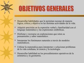 El documento presenta el plan de estudios del área de matemáticas para los años 2008-2010 en un colegio. Describe los objetivos del área como desarrollar habilidades de razonamiento y resolución de problemas en los estudiantes. También presenta la estructura organizativa y pedagógica del área, incluyendo los contenidos, procesos y estrategias de enseñanza a implementar. Además, propone un proyecto institucional a cargo del área sobre gestión de riesgos escolares.