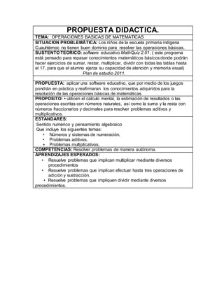 Este documento presenta una propuesta didáctica para mejorar el dominio de las operaciones básicas de matemáticas en estudiantes de tercer grado. La propuesta incluye el uso de un software educativo llamado Gcompris para que los estudiantes jueguen al memorama de las operaciones y aprendan de forma lúdica. Los estudiantes se dividirán en equipos para competir entre ellos en el juego del software con el fin de que practiquen y mejoren en sumas, restas, multiplicación y división.