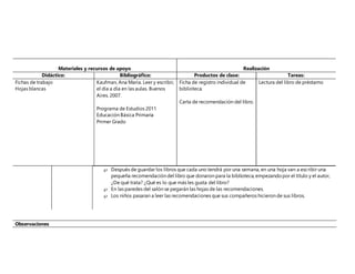 Este documento presenta la secuencia didáctica de una clase de español en primer grado. La secuencia se enfoca en recomendar libros por escrito. Las actividades incluyen organizar una biblioteca de libros traídos por los estudiantes, distribuir los libros entre los estudiantes, y escribir cartas recomendando el libro que cada estudiante donó.