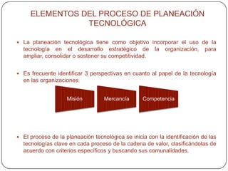 El documento describe el proceso de planeación tecnológica en una empresa. Inicia con una auditoría tecnológica para identificar las tecnologías usadas y su alineación con la estrategia. Luego, se desarrolla una estrategia tecnológica y un plan que incluye la adquisición, venta, liderazgo u seguimiento de tecnologías. Finalmente, se implementa el plan a través de la transferencia de tecnología y el manejo del cambio tecnológico con socios externos.