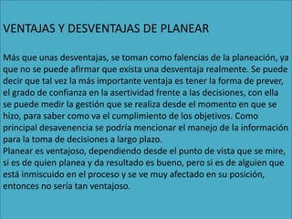 La planeación tiene varias ventajas y desventajas. Las principales ventajas son que ayuda a los administradores a anticipar el futuro, establecer objetivos claros para la organización, y coordinar decisiones a largo plazo. Una posible desventaja es que los planes pueden verse afectados por factores externos cambiantes y los administradores pueden no tener el tiempo suficiente para verificar que los planes se estén implementando correctamente. En general, la planeación es útil si los resultados cumplen con los objetivos, pero algunos individuos podrían verla neg