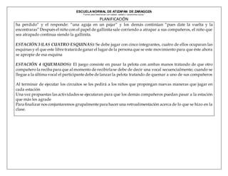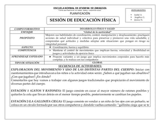 El documento presenta el plan de una sesión de educación física en la Escuela Normal de Atizapan de Zaragoza. La sesión incluye cuatro estaciones de juegos tradicionales para mejorar la coordinación y el control motor, como "gatos y ratones", "la gallinita ciega", "las cuatro esquinas" y "quemados". Al final, se pedirá a los estudiantes que propongan nuevas variantes a los juegos y dar una retroalimentación sobre la actividad.