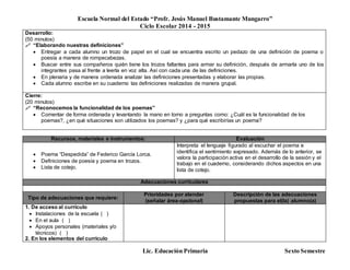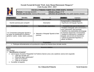 Este documento describe una secuencia didáctica para una clase de español sobre la escritura de poemas. La secuencia incluye tres partes: 1) introducir el haikú mediante preguntas y ejemplos, 2) los estudiantes escriben su propio haikú basado en un ejemplo en la guía de estudiantes, y 3) compartir y discutir los haikús escritos. El objetivo es que los estudiantes aprendan a expresar sentimientos usando recursos literarios como en la poesía.