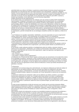 La planificación es la base fundamental para la gestión gerencial. Implica establecer objetivos y planes de acción para lograrlos de manera exitosa. La gestión gerencial utiliza la planificación táctica para guiar a las divisiones de una empresa hacia los objetivos mediante planes concretos, permitiendo que contribuyan al logro de los objetivos y controlando que las acciones se correspondan con los planes. El análisis DOFA es una herramienta clave para la planificación, identificando las fortalezas, debilidades, oportunidades y amenazas para des