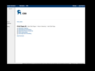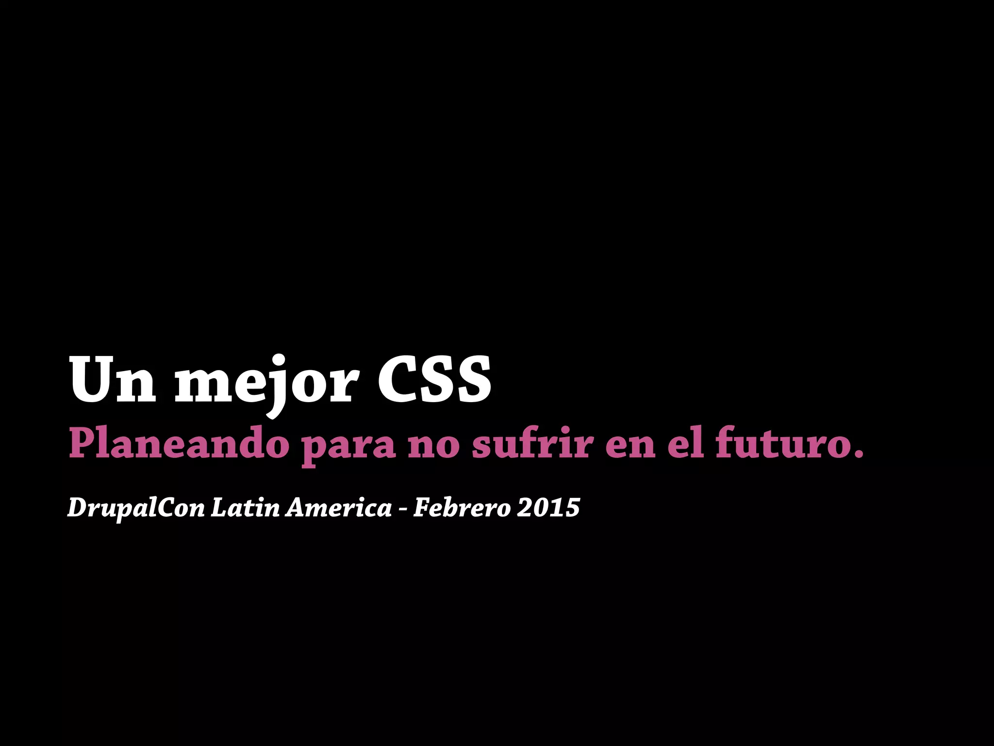 Este documento presenta consejos para escribir CSS de manera más eficiente y mantenible. Recomienda usar preprocesadores como Sass para dividir el CSS en piezas más pequeñas y reutilizables, y seguir metodologías como OOCSS y BEM. También enfatiza la importancia de comentarios, nombres consistentes y documentación para facilitar la colaboración entre desarrolladores.