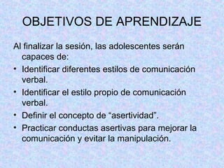 Este documento trata sobre la asertividad y la comunicación verbal. Explica que la asertividad se refiere a defender los derechos propios de manera directa y clara, sin ser agresivo ni pasivo. Identifica características de una persona asertiva y diferencia la asertividad de la agresividad y la pasividad. Además, ofrece consejos sobre cómo comunicarse de forma asertiva, como identificar sentimientos y ser específico al expresarlos.