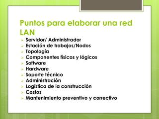 Este documento describe los puntos clave para establecer una red LAN para un ciber café, incluyendo componentes como servidores, estaciones de trabajo, topología, hardware, software, soporte técnico, administración, costos y mantenimiento. Explica los detalles de configurar cada elemento y las especificaciones técnicas del equipo a utilizar.