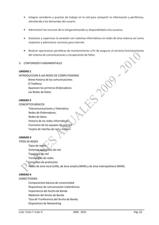 Este documento presenta el programa curricular anual para la asignatura de Redes de Área Local en el Colegio Técnico Agropecuario "Marcabelí" para el año lectivo 2009-2010. El programa describe los objetivos de la asignatura, los contenidos fundamentales organizados en cinco unidades temáticas, el sistema de evaluación, y los recursos y metodología de enseñanza. El objetivo general es implantar y administrar redes de área local para gestionar la conexión a sistemas informáticos en redes extensas.