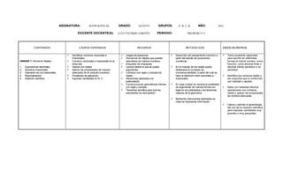 Este documento presenta los planes de estudio de las asignaturas de matemáticas, geometría y estadística para los grados 8°, 9° y 10°. Incluye los estándares curriculares, contenidos, logros esperados, recursos, metodologías y evaluaciones para cada unidad temática. Las asignaturas abarcan temas como números reales, polinomios, geometría plana y del espacio, estadística básica y álgebra.