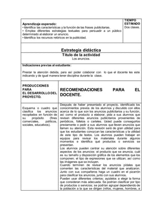 Este documento presenta una secuencia didáctica para enseñar español en primaria, con un enfoque en la elaboración de anuncios publicitarios. La secuencia incluye actividades como analizar anuncios existentes para identificar sus características, discutir el uso de estereotipos, y producir borradores de anuncios propios sobre servicios de la comunidad. El objetivo es que los estudiantes aprendan a crear anuncios persuasivos y a identificar recursos retóricos en la publicidad.