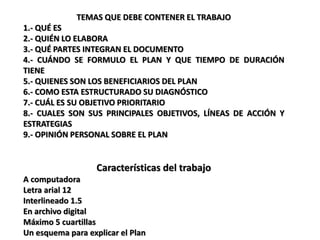 El documento presenta los temas que debe contener un trabajo sobre planes de desarrollo, incluyendo una descripción de diferentes planes de desarrollo a nivel nacional, estatal y municipal, así como los aspectos que debe cubrir el trabajo como qué es el plan, quien lo elabora, su diagnóstico, objetivos y opinión personal sobre el plan seleccionado. El trabajo no debe exceder las 5 cuartillas y debe incluir un esquema explicativo.