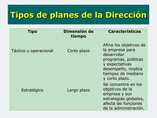 El documento describe dos tipos principales de planes de la dirección: planes tácticos u operacionales y planes estratégicos. Los planes tácticos se enfocan en objetivos de corto y mediano plazo y son conducidos por ejecutivos de nivel medio. Los planes estratégicos se concentran en los objetivos y estrategias a largo plazo de la empresa y afectan a toda la administración.