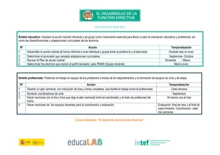 Este documento presenta los planes de mejora para varios ámbitos de un centro educativo. Propone acciones como desarrollar la acción tutorial individual y de grupo, potenciar el trabajo en equipo del profesorado, hacer de la evaluación un instrumento de motivación, mantener relaciones de colaboración con otras instituciones, e implementar metodologías como el aprendizaje basado en proyectos.