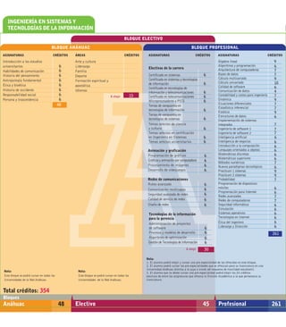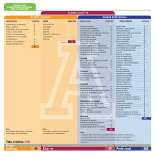 Este documento presenta los bloques de asignaturas para dos carreras universitarias. Ambas carreras incluyen un bloque de asignaturas Anáhuac, un bloque electivo y un bloque profesional. El bloque Anáhuac contiene asignaturas generales, el bloque electivo ofrece opciones de pre-especialización y el bloque profesional se enfoca en las asignaturas técnicas de cada carrera.