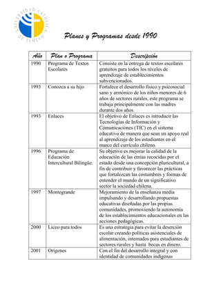 El documento describe varios planes y programas implementados por el Ministerio de Educación de Chile desde 1990 hasta 2011, incluyendo el Programa de Textos Escolares gratuitos en 1990, programas de apoyo para niños en edades tempranas y comunidades indígenas en la década de 1990 y 2000, y diversos programas desde 2002 en adelante para fortalecer la calidad de la educación, capacitación docente y retención estudiantil.