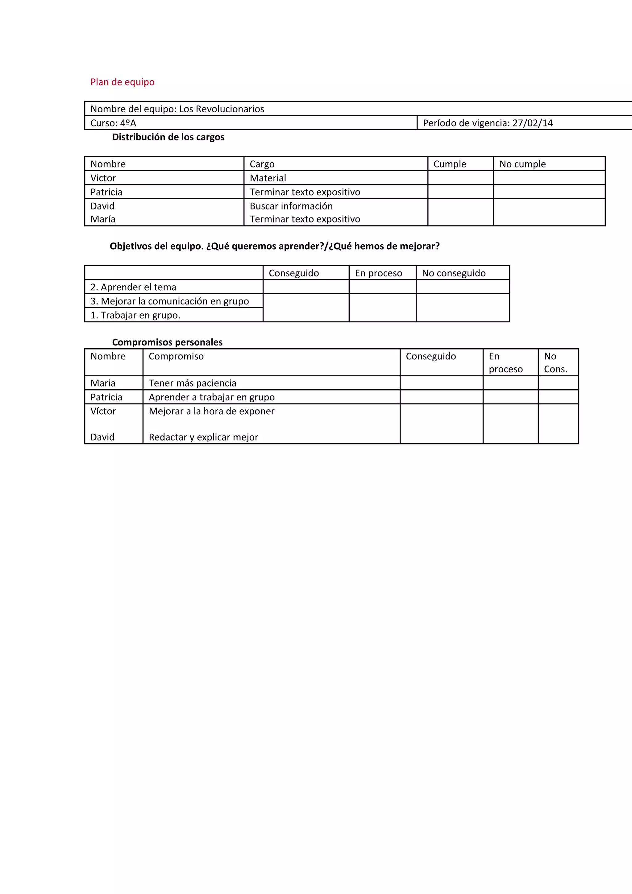 Este documento presenta los planes de cinco equipos de estudiantes para un proyecto escolar. Cada plan detalla los nombres y cargos de los miembros del equipo, sus objetivos, y compromisos personales para mejorar las habilidades de trabajo en equipo y el aprendizaje del tema.