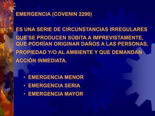 El documento proporciona información sobre planes de emergencia. Define una emergencia y explica que un plan de emergencia es un procedimiento escrito que permite responder de manera adecuada y oportuna ante casos de emergencia mediante una acción coordinada. Detalla los objetivos y pasos para la elaboración de un plan de emergencia, incluyendo la estructura organizativa y recomendaciones. El objetivo principal de los planes de emergencia es garantizar la supervivencia y continuidad minimizando el impacto de eventos indeseables.