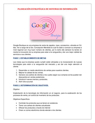 El documento presenta un plan estratégico de sistemas de información para Google Boutique, una empresa de venta de ropa y accesorios. El plan establece metas como desarrollar ventas electrónicas y mejorar la atención al cliente. Luego determina objetivos como controlar inventario y ofrecer productos en internet. Finalmente, propone recursos tecnológicos iniciales como una computadora, impresora e implementar una base de datos para almacenar información de productos y clientes.
