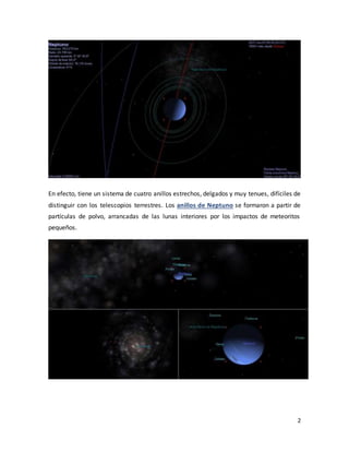 Neptuno es el planeta más exterior del Sistema Solar. Es un gigante gaseoso compuesto principalmente por hidrógeno, helio y metano que le da su color azul. Neptuno tiene vientos extremadamente fuertes, inclinación magnética inusual y un sistema de anillos delgados compuestos de polvo.