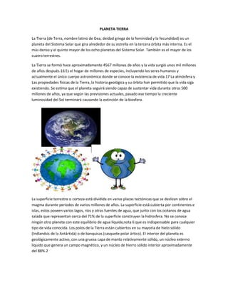 La Tierra es el quinto planeta más grande del Sistema Solar y se formó hace aproximadamente 4,567 millones de años. La vida surgió en la Tierra hace unos mil millones de años y los seres humanos son la única forma de vida conocida en el planeta. La atmósfera, historia geológica y órbita de la Tierra han permitido que la vida persista, aunque se estima que solo podrá sustentar vida durante otros 500 millones de años debido al aumento de la luminosidad del Sol. La superficie terrestre está dividida en