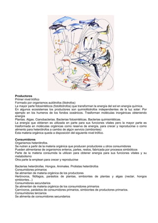 La biosfera está compuesta por todos los seres vivos en la Tierra y sus interacciones con la atmósfera, hidrosfera y geosfera. Los ecosistemas son conjuntos de seres vivos que interactúan entre sí y con su entorno. Dentro de los ecosistemas hay redes tróficas que transfieren energía a través de las cadenas alimenticias, con productores, consumidores y descomponedores reciclando la materia.