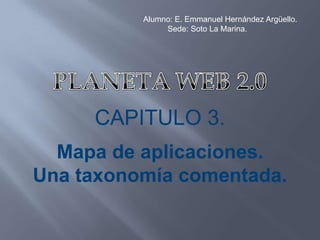 Este documento presenta una taxonomía comentada de las principales aplicaciones de la Web 2.0, organizadas en cuatro categorías: redes sociales, contenidos, organización de información e inteligencia, y aplicaciones y servicios. Explica brevemente cada categoría y destaca algunas aplicaciones representativas como Facebook, Wikipedia y Flickr.