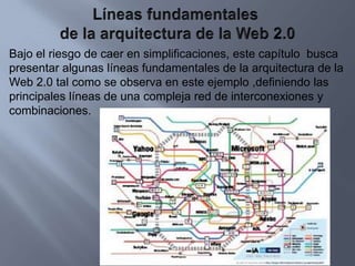 Este documento presenta una taxonomía comentada de las principales aplicaciones de la Web 2.0, organizadas en cuatro categorías: redes sociales, contenidos, organización de información e inteligencia, y aplicaciones y servicios. Explica brevemente cada categoría y destaca algunas aplicaciones representativas como Facebook, Wikipedia y RSS. El objetivo es ofrecer una guía para seleccionar herramientas útiles de la Web 2.0.