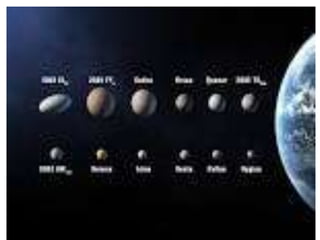 Este documento define los planetas como cuerpos que orbitan una estrella y que han limpiado su órbita de otros objetos, lo que les permite tener una forma esférica debido a su propia gravedad. Explica que objetos como asteroides y planetas enanos no cumplen estas características. Finalmente, enumera los ocho planetas de nuestro Sistema Solar y describe cómo Plutón pasó a clasificarse como planeta enano.