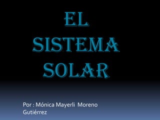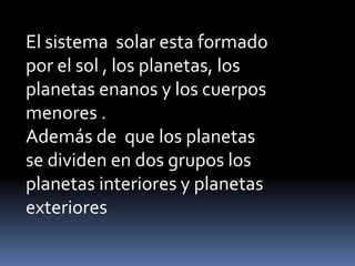 El documento describe los componentes principales de nuestro sistema solar. Explica que está formado por el Sol y los planetas, incluyendo planetas interiores como Mercurio, Venus y la Tierra, y planetas exteriores como Júpiter, Saturno, Urano y Neptuno. También incluye planetas enanos como Plutón, y cuerpos menores como asteroides y cometas que orbitan el Sol.