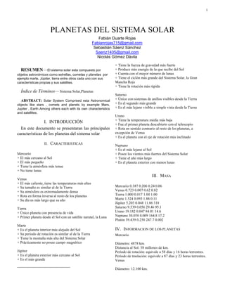 El documento resume las características de los planetas del sistema solar, incluyendo su tamaño, distancia al Sol, períodos de rotación y traslación. Describe cada planeta y proporciona datos sobre su diámetro, distancia, y períodos. Además, destaca algunos hechos interesantes sobre cada planeta como las temperaturas extremas de Venus, la tectónica de placas en la Tierra, las grandes características geológicas de Marte y el gran campo magnético de Júpiter.