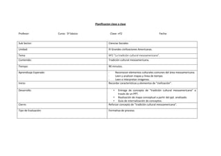Este documento contiene 6 planes de clase para enseñar sobre las grandes civilizaciones americanas a estudiantes de 5o básico. Los planes cubren temas como las características de las civilizaciones, la tradición cultural mesoamericana, las civilizaciones maya y azteca, e incluyen objetivos de aprendizaje, actividades y evaluaciones para cada clase.