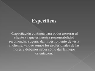El documento detalla los objetivos generales y específicos de una empresa de arreglos florales. Los objetivos generales son determinar la necesidad del mercado en Quito y ofrecer entrega a domicilio. Los objetivos específicos incluyen capacitar continuamente al personal para asesorar a los clientes, innovar constantemente, satisfacer las necesidades de los clientes con alta calidad, incrementar anualmente la producción y ventas, y optimizar los recursos humanos de la empresa.