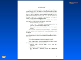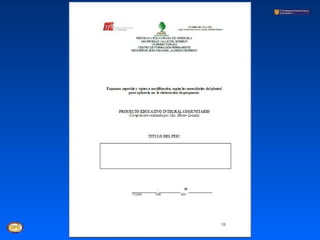 El documento presenta un proyecto educativo integral comunitario. Propone involucrar a la comunidad en el desarrollo de programas educativos que atiendan las necesidades locales. El objetivo es mejorar la educación mediante un enfoque participativo e integral que incluya a todos los miembros de la comunidad.