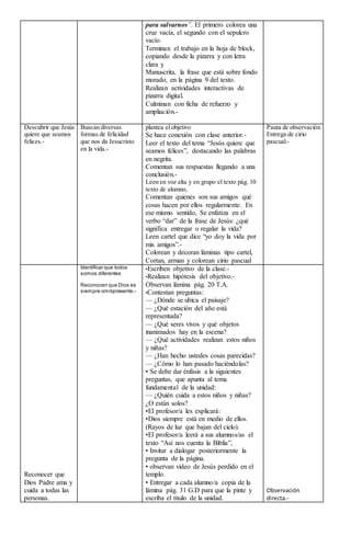 El documento presenta el plan de trabajo de la asignatura de Religión para el curso 2dos durante el año escolar 2015 en la Escuela Héroes de Chile. El plan describe las habilidades, indicadores, actividades y formas de evaluación para 5 unidades que abarcan desde marzo hasta abril. Las unidades cubren temas como la vida de Jesús, su pasión, resurrección, el perdón de Dios y la enseñanza de Jesús de ayudar a los demás. Cada unidad incluye objetivos, conexiones con lecciones anteriores, lecturas bí