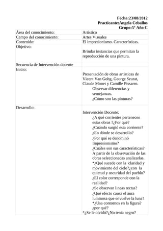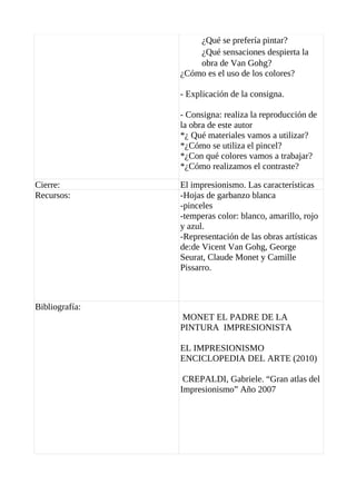 El documento presenta una lección sobre el impresionismo en artes visuales. Se muestran obras de Van Gogh, Seurat, Monet y Pissarro y se analizan sus características, como el uso del color y la falta de contornos. Luego, los estudiantes reproducen una obra usando pinceles, hojas blancas y temperas de colores primarios, para entender mejor las técnicas impresionistas.