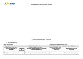 Este documento contiene 6 planes de bloque curricular para el área de Informática del primer año de bachillerato. Cada plan describe las destrezas, horas, estrategias metodológicas, recursos, y indicadores de evaluación para cada bloque. Los bloques cubren temas como el uso de programas de ofimática, correo electrónico, redes sociales, blogs, wikis y la validación de información en Internet.