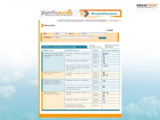 Educarchile es un portal educativo chileno creado en 2001 por el Ministerio de Educación y Fundación Chile. Proporciona herramientas y recursos para docentes, estudiantes y familias. Ofrece espacios de planificación, búsqueda de materiales educativos y comunicación. Los docentes pueden crear perfiles con sus niveles y asignaturas, acceder a planificaciones existentes y crear sus propias planificaciones de 4 clases con objetivos, actividades y recursos digitales.