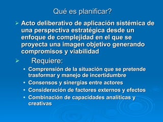 El documento proporciona información sobre la planificación por proyectos. Explica que la planificación requiere comprender la situación a transformar, consensos entre actores, y considerar factores externos. Un proyecto es un sistema de acción que produce cambio en una situación mediante la interacción de elementos. La política provee directrices estratégicas a largo plazo, los programas coordinan proyectos hacia un fin, y los proyectos son intervenciones de corto plazo.
