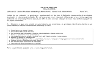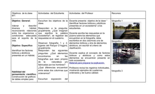 Este documento presenta una planificación para una clase de Ciencias sobre ecosistemas. La planificación incluye 3 objetivos, actividades del estudiante y del profesor, y recursos. Los estudiantes identificarán factores bióticos y abióticos, reconocerán relaciones entre organismos, e identificarán pasos del método de investigación. Las actividades involucran observar fotografías, hacer hipótesis, recolectar datos, y comunicar conclusiones. El profesor guiará las discusiones y entregará materiales como fotografías