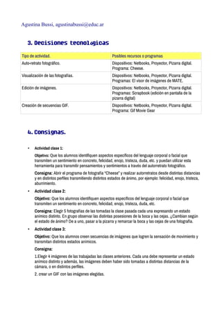 El documento presenta un plan de trabajo de arte con TICs para crear secuencias de imágenes GIF expresivas. El plan consta de tres clases donde los estudiantes primero toman selfies expresando emociones, luego identifican elementos faciales emocionales, y finalmente crean GIFs secuenciales expresivos utilizando las imágenes tomadas. El objetivo es que los estudiantes aprendan a comunicar pensamientos y sentimientos a través de la fotografía y GIFs.