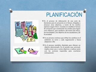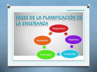 La planificación educativa consiste en un proceso continuo para establecer objetivos y medios óptimos para lograr las necesidades de los estudiantes y la sociedad. Incluye cuatro fases: 1) diagnóstico para evaluar el punto de partida, 2) establecer objetivos precisos y medibles, 3) seleccionar estrategias metodológicas adecuadas, y 4) prever la evaluación de competencias. Una planificación efectiva es flexible, objetiva, integral y continua.