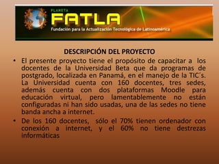 Este documento describe un proyecto para capacitar a 160 docentes de una universidad en Panamá en el uso de las TIC a través de dos cursos. El proyecto utilizará la metodología PACIE e implementará el uso de plataformas virtuales. Un curso se enfocará en los 112 docentes con acceso a internet, mientras que el otro curso, con horarios flexibles, se enfocará en los 48 docentes sin acceso a internet.