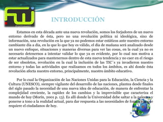 Este documento presenta un plan de capacitación para docentes universitarios en el uso de tecnologías de la información y comunicación (TIC) y la metodología PACIE. El plan consta de 4 etapas: motivación, capacitación, implementación y evaluación. Incluye 6 módulos de capacitación, recursos, cronograma y evaluación del programa. El objetivo es actualizar a los docentes en el uso de las TIC para la educación superior.