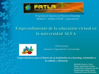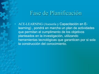 La universidad Alfa desea implementar la educación virtual. El plan propone: 1) Crear un departamento de educación en línea para administrar la transición; 2) Capacitar a los docentes en el uso de herramientas tecnológicas durante un año; 3) Desarrollar una página web, aulas virtuales y conectividad en 4 fases a lo largo de 6 meses. El objetivo es brindar educación de calidad a estudiantes de Guatemala, Latinoamérica y el mundo.