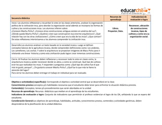Este documento presenta la planificación de una clase sobre la civilización inca. La clase abordará la organización social, formas de cultivo y construcciones de los incas. Los estudiantes analizarán textos e imágenes para comprender cómo era la vida de los incas, incluyendo su sistema agrícola y arquitectura notable como Machu Picchu. La evaluación consistirá en reconocer aspectos culturales incas.